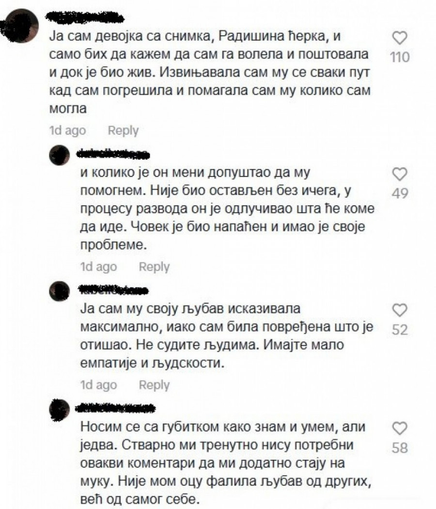 Svedok sahrane bio je i naš portal, a na vest o njenom govoru na društvenoj mreži Tik-tok odgovorila nam je upravo Radišina ćerka i nastavila svoju bolnu ispovest. Nju su pogodili pojedini komentari nepoznatih ljudi koji su dali sebi za pravo da dovedu u pitanje njihov odnos i njegovo stanje pre samoubistva.