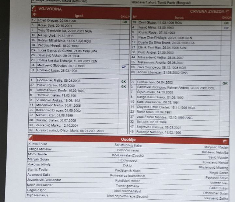 Crvena zvezda: Glazer – Seol, Milosavljević, Đurić, Anan – Krunić, Elšnik – Maksimović, Ivanić, Duarte – Endijaje Za nešto manje od dva sata očekuje nas pravi spektakl na stadionu "Kraljevica" u Zaječaru, gde će fudbaleri Crvene zvezde pokušati da odbrane titulu. Protivnik im je novosadska Vojvodina, ekipa koja je igrala finale protiv Zvezde prošle godine, pa s toga sledi jedna lepa repriza meča.
