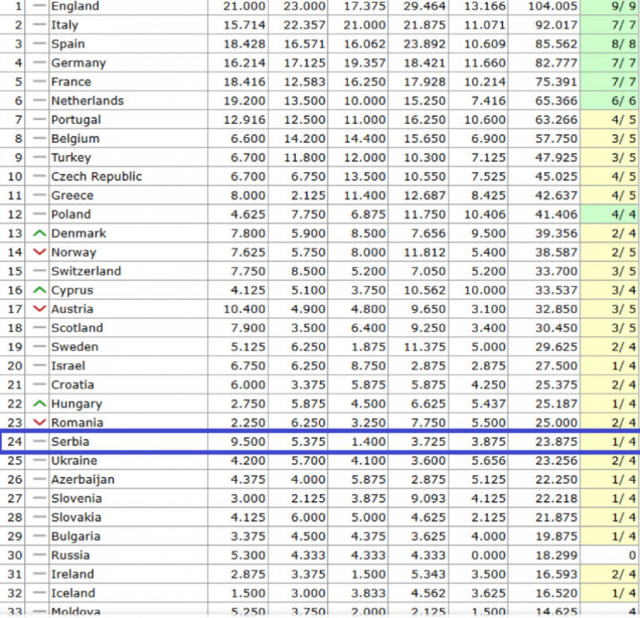 Srbija se trenutno nalazi na 24. poziciji na UEFA rang listi, što je ključna informacija s obzirom na to da je ovo poslednje mesto koje garantuje start iz drugog kola kvalifikacija za Ligu šampiona.