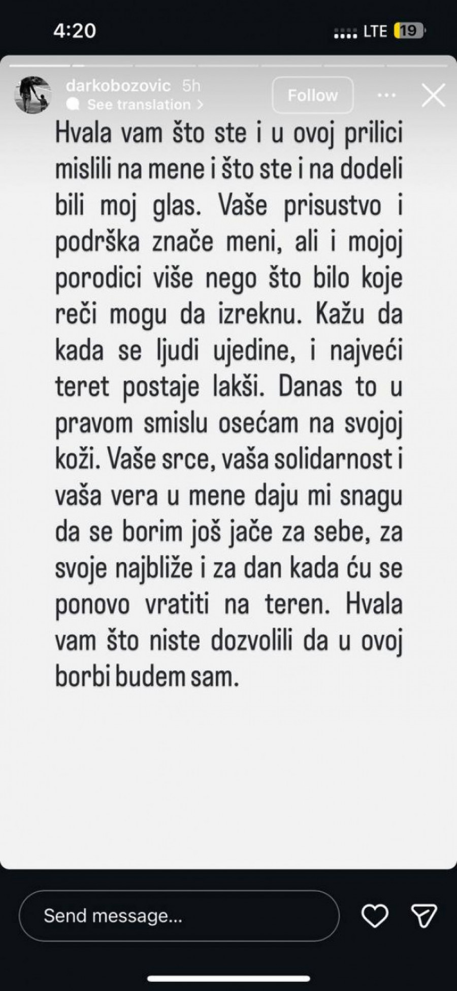 - Hvala vam što ste i u ovoj prilici mislili na mene i što ste i na dodeli bili moj glas. Vaše prisustvo i podrška mi znače, ali i mojoj porodici, više nego što bilo koje reči mogu da izreknu. Kažu da, kada se ljudi ujedine, i najveći teret postaje lakši. Danas to u pravom smislu osećam na svojoj koži. Vaše srce, vaša solidarnost, vera u mene daju mi snagu da se borim još jače za sebe, najbliže i za dan kada ću se ponovo vratiti na teren. Hvala vam što niste dozvolili da u ovoj borbi budem sam.