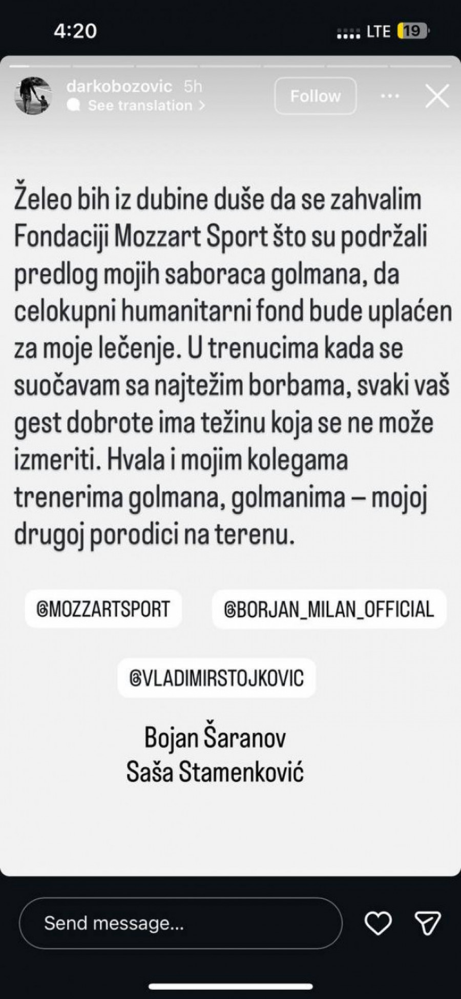 - Želeo bih iz dubine duše da zahvalim fondaciji Mozzart sport što su podržali predlog mojih saboraca golmana, da celokupni humanitarni fond bude uplaćen za moje lečenje. U trenucima kada se suočavam s najtežim borbama, svaki vaš gest dobrote ima težinu koja se ne može izmeriti. Hvala i mojim kolegama, trenerima golmana, golmanima - mojoj drugoj porodici na terenu - napisao je Božović i dodao: