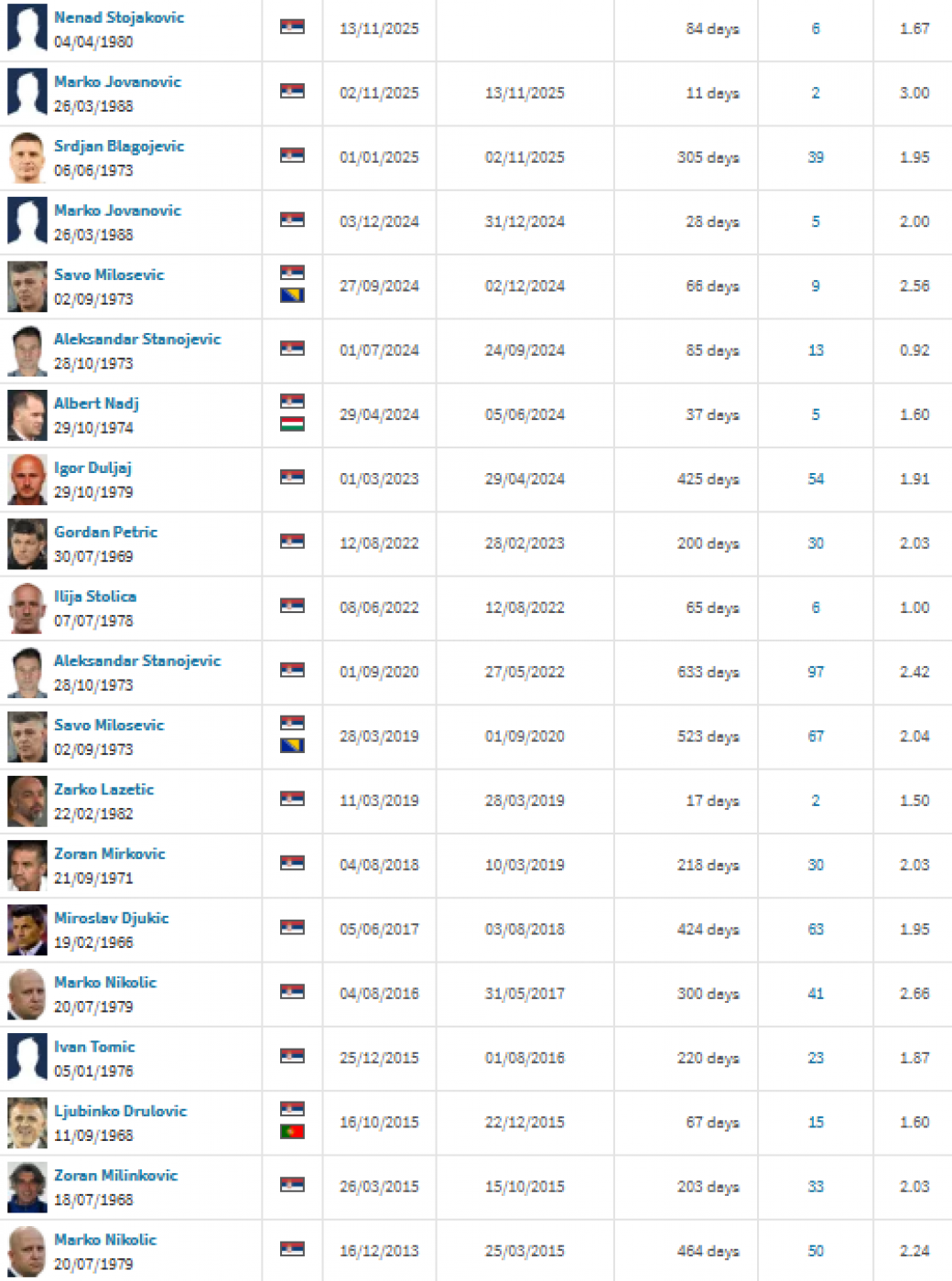 U januaru 2025. na klupu dolazi Srđan Blagojević, koji vodi tim 305 dana kroz 39 utakmica. Marko Jovanović ponovo preuzima ekipu u novembru 2025, ali samo na 11 dana i dve utakmice. Poslednji u nizu, Nenad Stojaković, vodi ekipu od 13. novembra 2025. do 5. februara 2026, kroz 84 dana i šest utakmica.