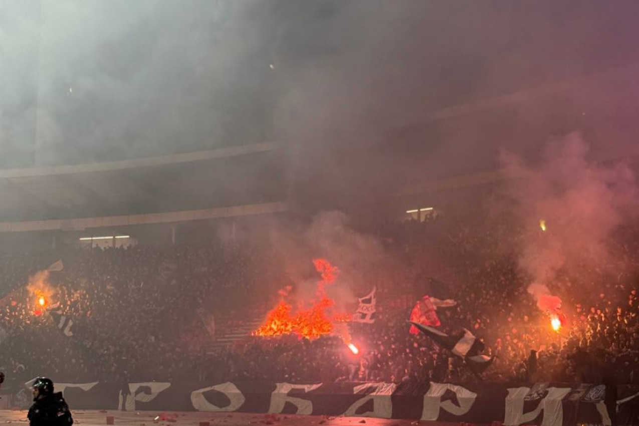 Nakon što su najvatrenije pristalice Partizana izazvale seriju incidenata, situacija je kulminirala paljenjem plastičnih stolica u centralnom delu južne tribine. Gust crni dim ubrzo je prekrio taj deo stadiona, što je naložilo hitnu reakciju nadležnih službi. Vatrogasna jedinica je, uz pratnju pripadnika Žandarmerije, ušla na tribinu kako bi lokalizovala požar i sprečila širenje vatre ka ostalim sektorima.