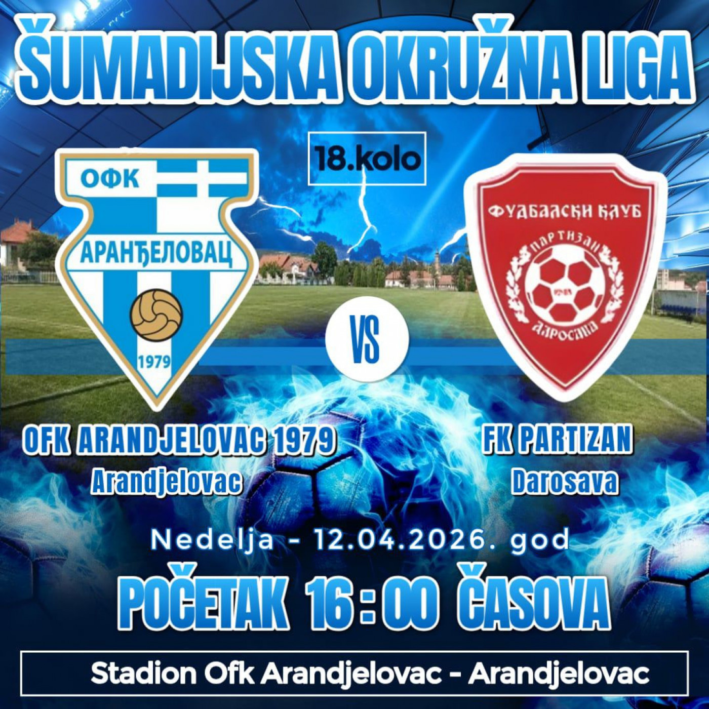U okviru 18. kola Šumadijske okružne lige ekipa OFK Aranđelovca će pred svojim navijačima odmeriti snage sa sastavom Partizana iz Darosave. Komšijski derbi zakazan je za nedelju 12. april, s početkom od 16 časova.