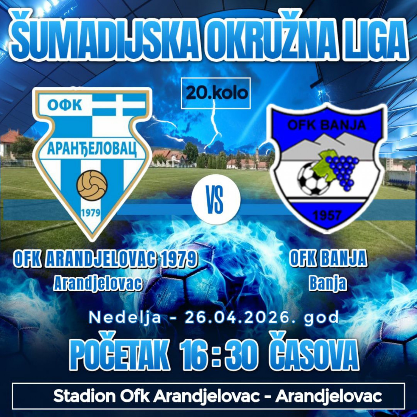 U okviru 20. kola Šumadijske okružne lige ekipa OFK Aranđelovca 1979 ugostiće sastav Banje u nedelju, 26. aprila sa početkom od 16 časova i 30 minuta.