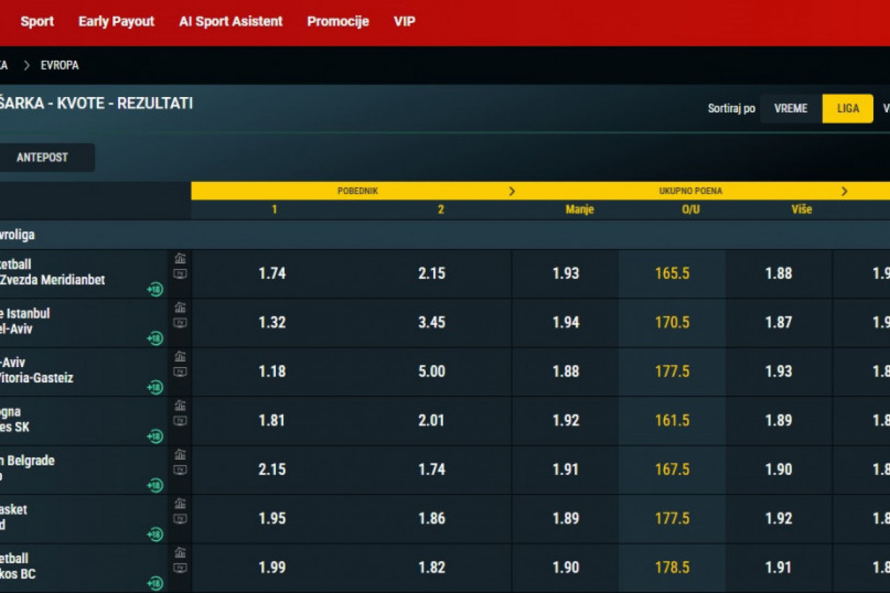Jasno je da je poverenje u Partizan poljujano, ali stručnjaci su prvi put ove sezone stavili Žocovu četu u podređeni položaj kada igraju kod kuće. Naime, na svim domaćim kladionicama favorit za pobedu u Beogradskj areni je Monako. Kvota na tim iz Kneževine je 1,74 u recimo Meridianbet kladionici, dok je kvota na Partizan tek 2,15. Ono što hrabri je činjenica da se očekuje tesan meč, pa je tako hendiep stavljen na samo 2,5 poena.