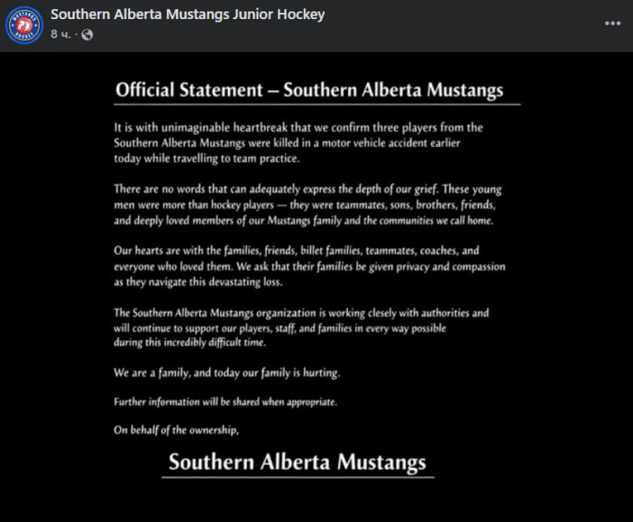 Tragedija se dogodila u Stevliju, mestu udaljenom 16 kilometara od Kalgarija, kada je automobil u kojem su se nalazili tinejdžeri podleteo pod kamion. Tužnu vest putem društvenih mreža objavio je klub Sautern Alberta Mustangs.