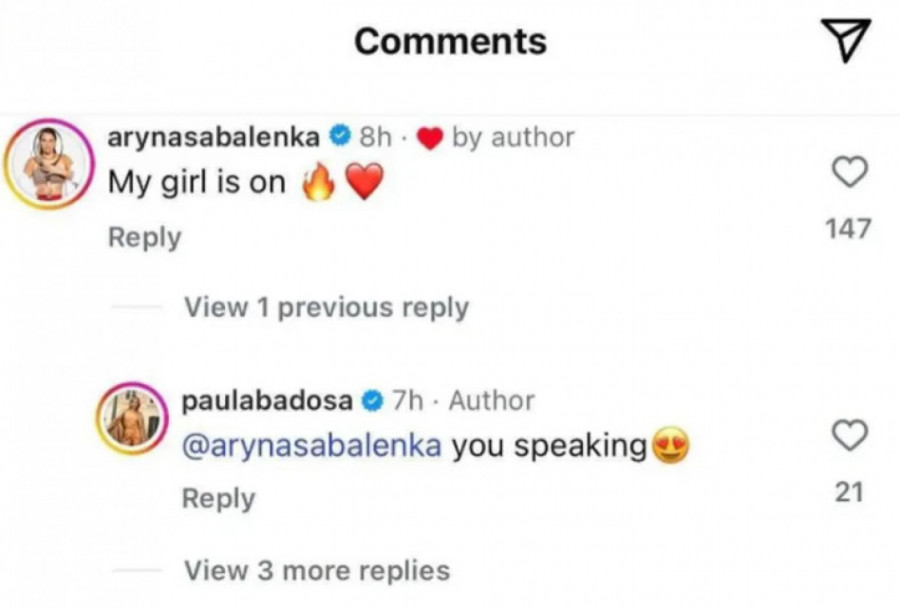 Badosa je na svom Instagramu podelila seriju fotografija koje dokumentuju njene aktivnosti tokom odmora. Na slikama se mogu videti njeni treninzi na terenu i u teretani, trenutci opuštanja na plaži, uživanje u hrani, kao i zabavni trenuci sa prijateljima. Uz opis „Još jedna nedelja u knjigama“, njena rečenica „Moja devojka gori“ dodatno naglašava bliskost između Badosa i Sabalenke, što je još jedan pokazatelj snage njihove prijateljske veze.