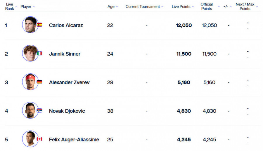Lorenco Muzeti je osmi sa 4.040 bodova, Ben Šelton je nakon što je pokvario plasman za pet mesta deveti na svetu sa 3.970 bodova, a u TOP 10 najboljih igrača je još i Džek Drejper sa 2.990.