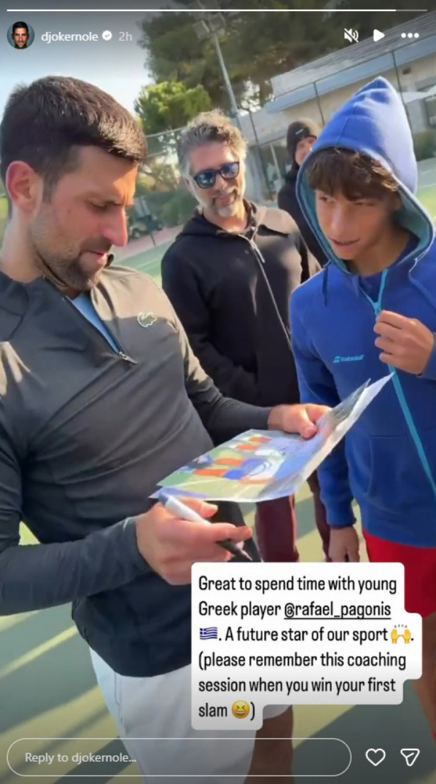 Nakon treninga, Đoković je podelio sliku sa Rafaelom, na kojoj se obojica osmehuju, što jasno pokazuje koliko im je taj trenutak značio. Na fotografiji, Đoković je ostavio svoj autogram, ali i inspirativnu poruku koja može da hrabri ne samo mladog Pagonisa, već i celu Grčku.