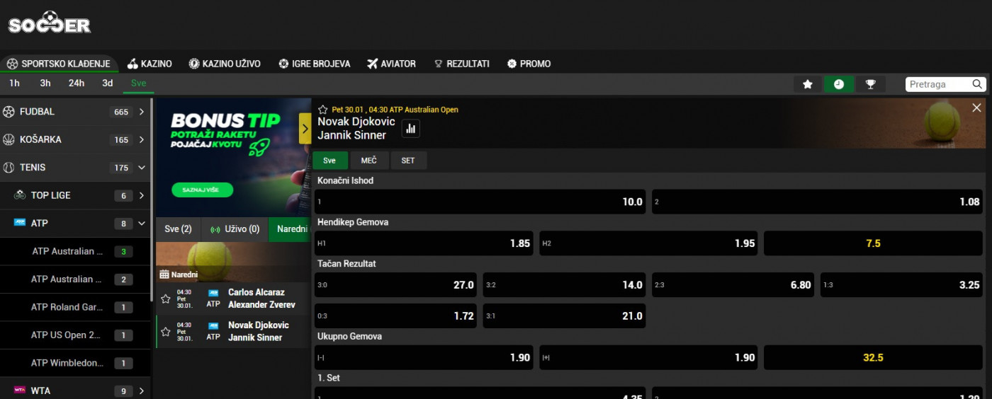 Imajući sve ovo u vidu, nije iznenađenje da je Siner favorit, ali kvote koje su izašle danas su sramne. Skandalozno je da je osvajač deset titula u Melburnu i čovek koji je osvojio 24 rekordna grend slema tako ponižen. Naime, kvota na pobedu Janika Sinera u polufinalu na svim kladionicama, pa i na Soccerbetu, jeste samo 1,08! Odnosno na trijumf Novaka Đokovića je čak 10,00.